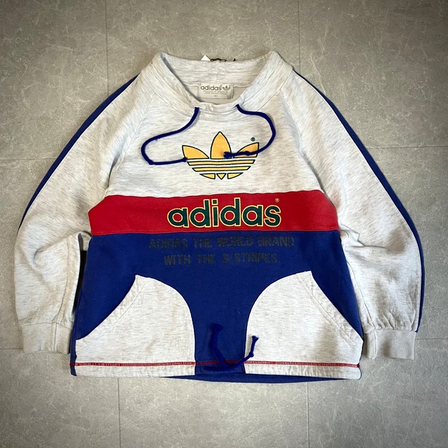 ブランド : adidas ⚫︎年代:1990 ⚫︎素材:コットン ⚫︎カラー:マルチ ⚫︎size 130cm 着丈 51cm 首つけね〜袖裾 52.5cm 身幅 46cm 所々汚れがあります、画像にてご確認下さい。 小さい穴あきがあった部分は補修しております。 細かく写真写しておりますのでご確認下さいませ。 首元、裾のひもはこちらで新しい物を入れています。