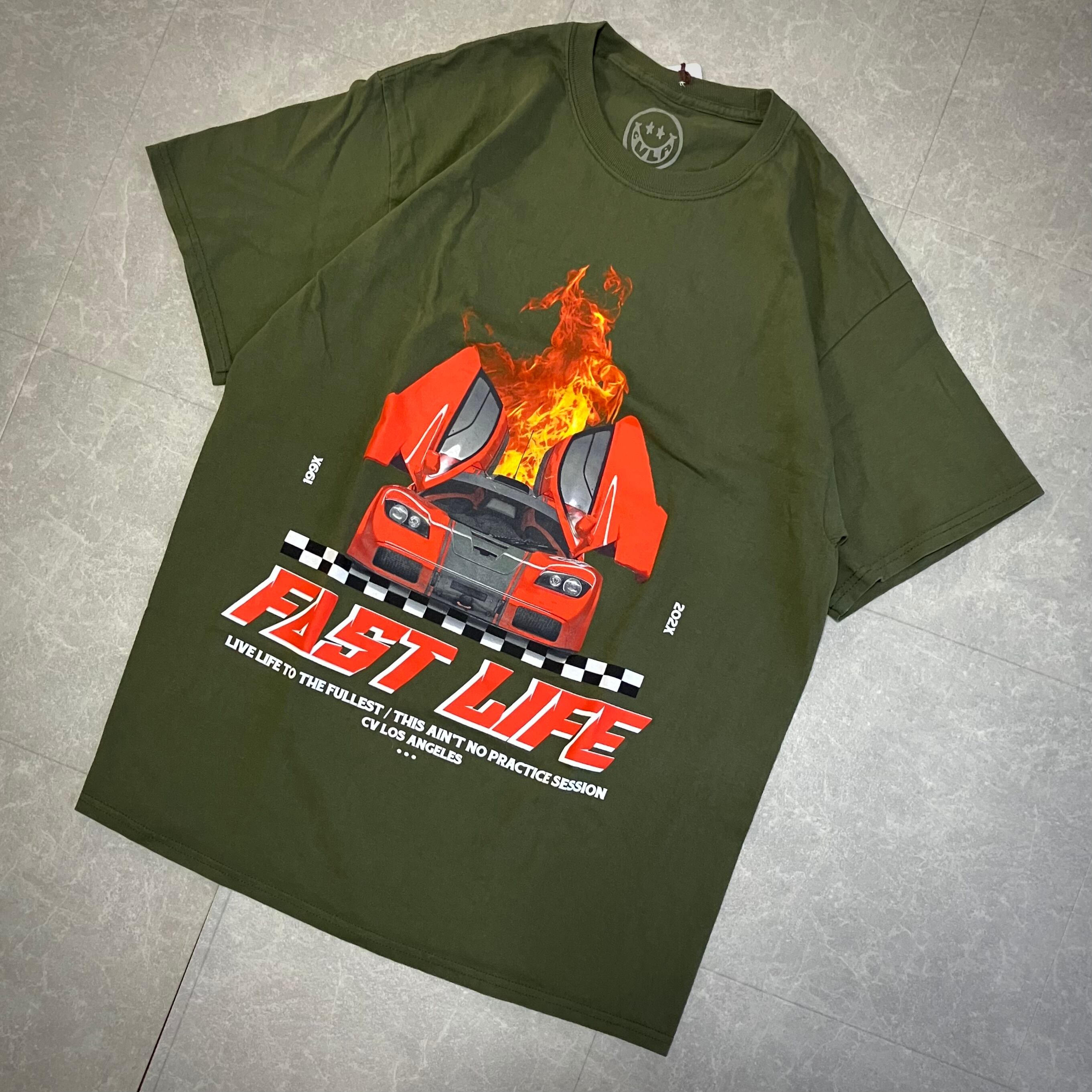 FAST LIFE カープリント ファイヤープリントTシャツ カーキ Lサイズ