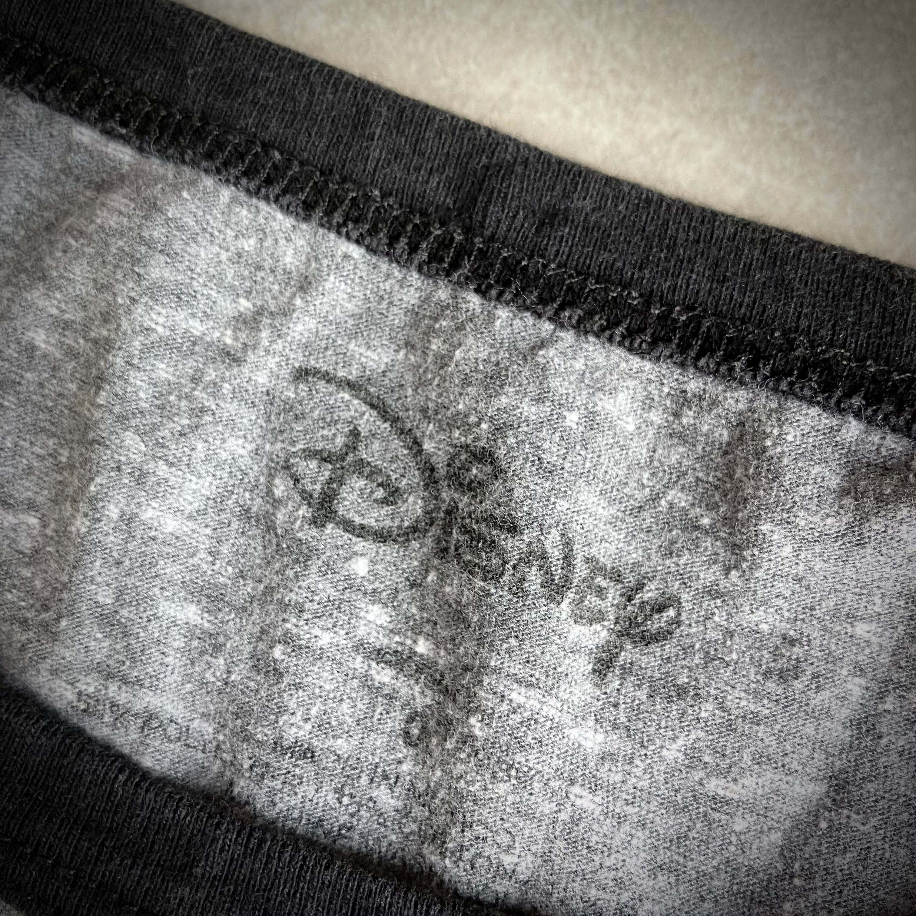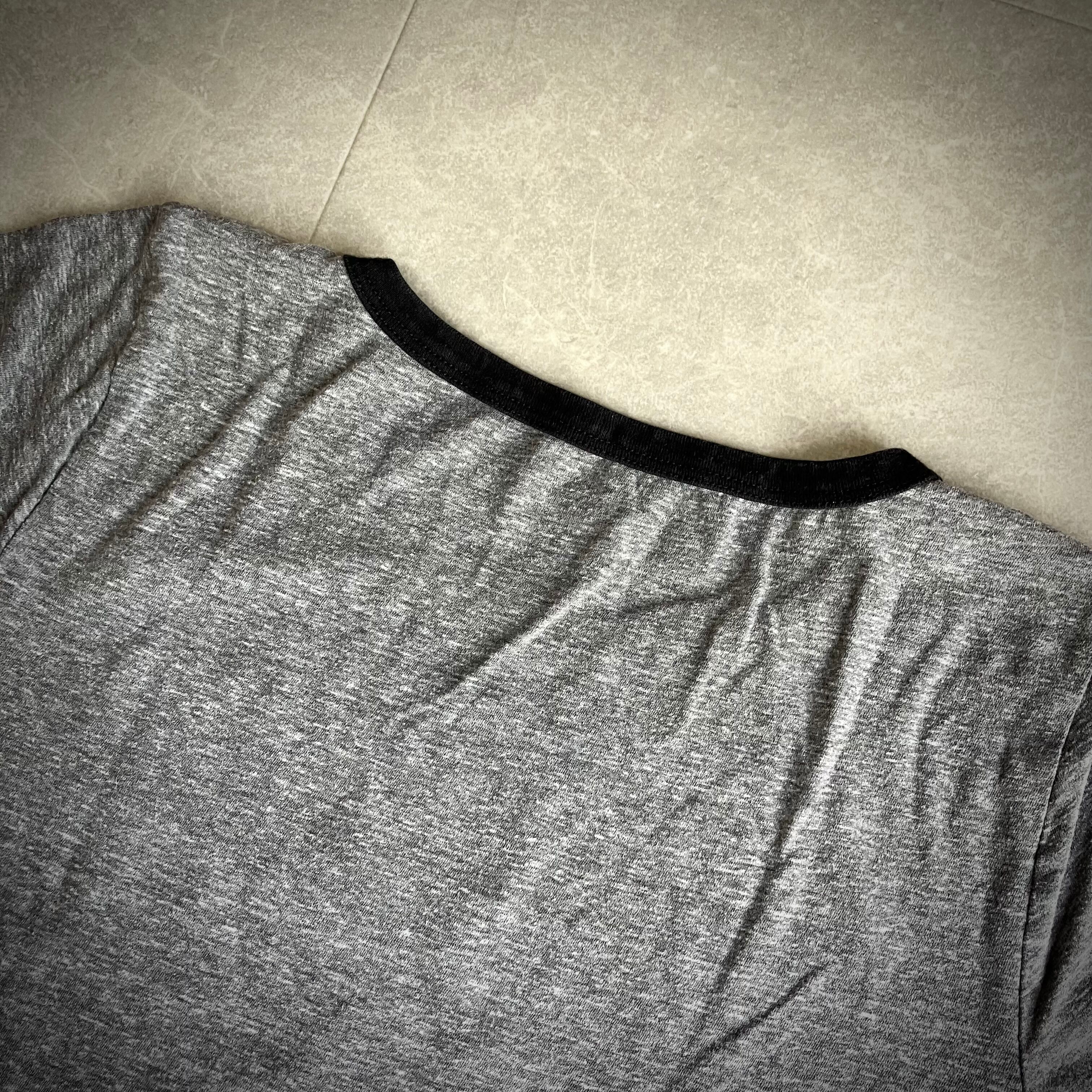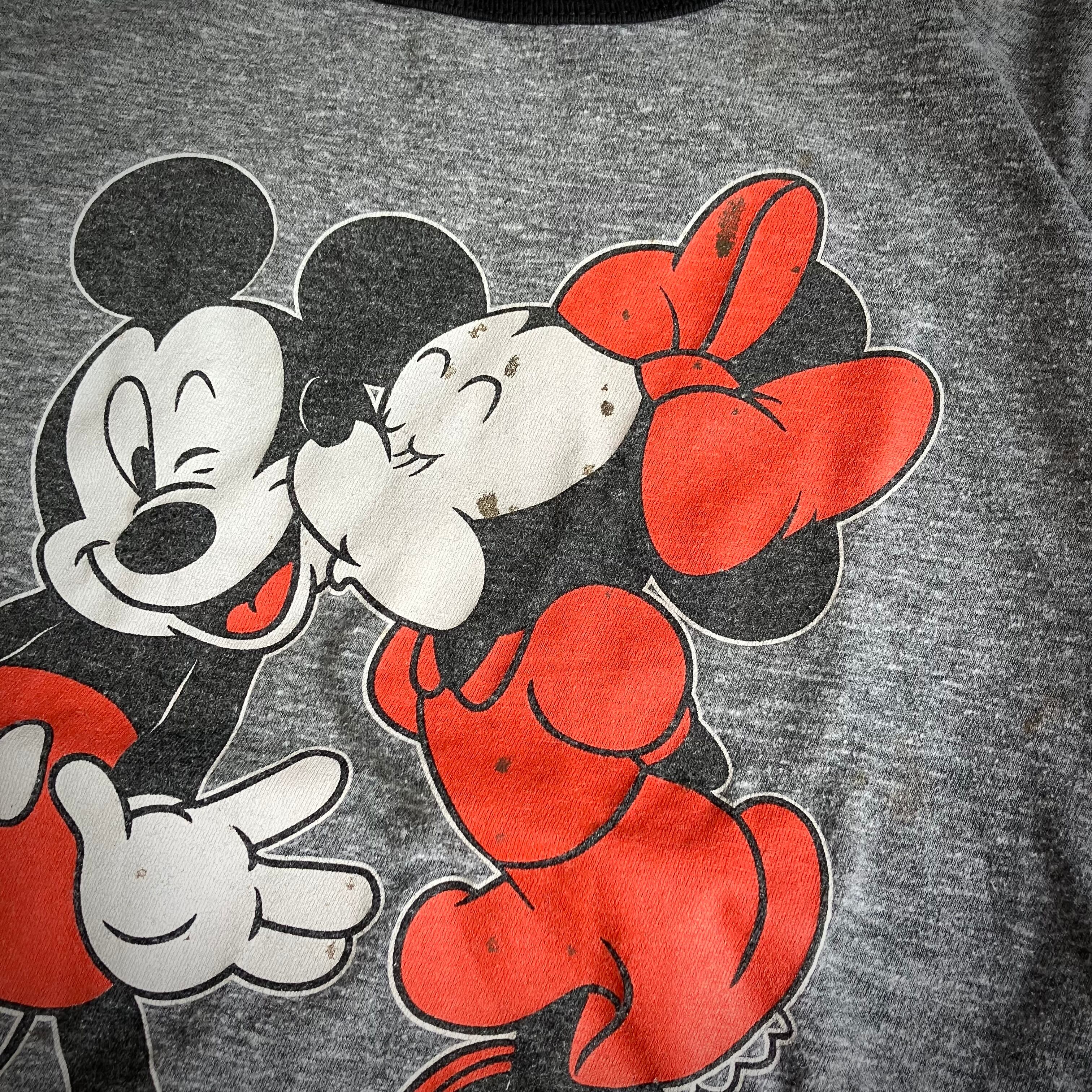 ミッキーマウスとミニーマウスの可愛いプリントが施されたグレーの半袖リンガーTシャツです。