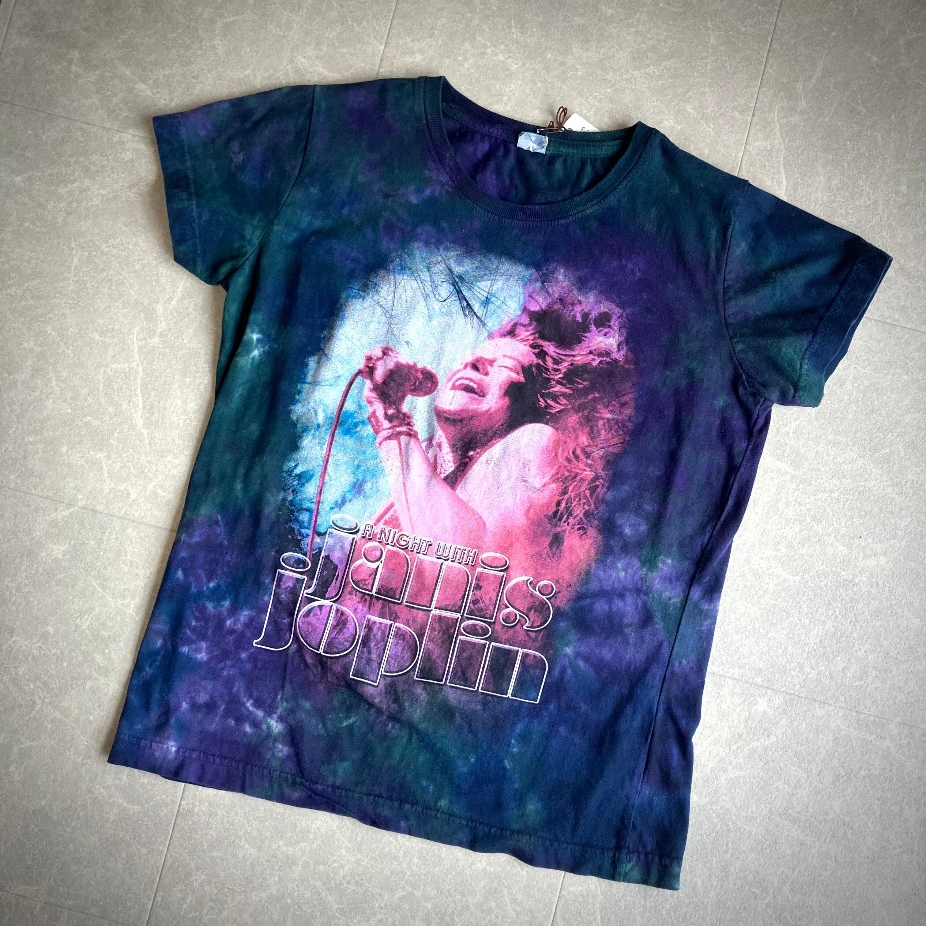 ジャニス・ジョプリンのグラフィックが施されたタイダイカラーの半袖Tシャツ。