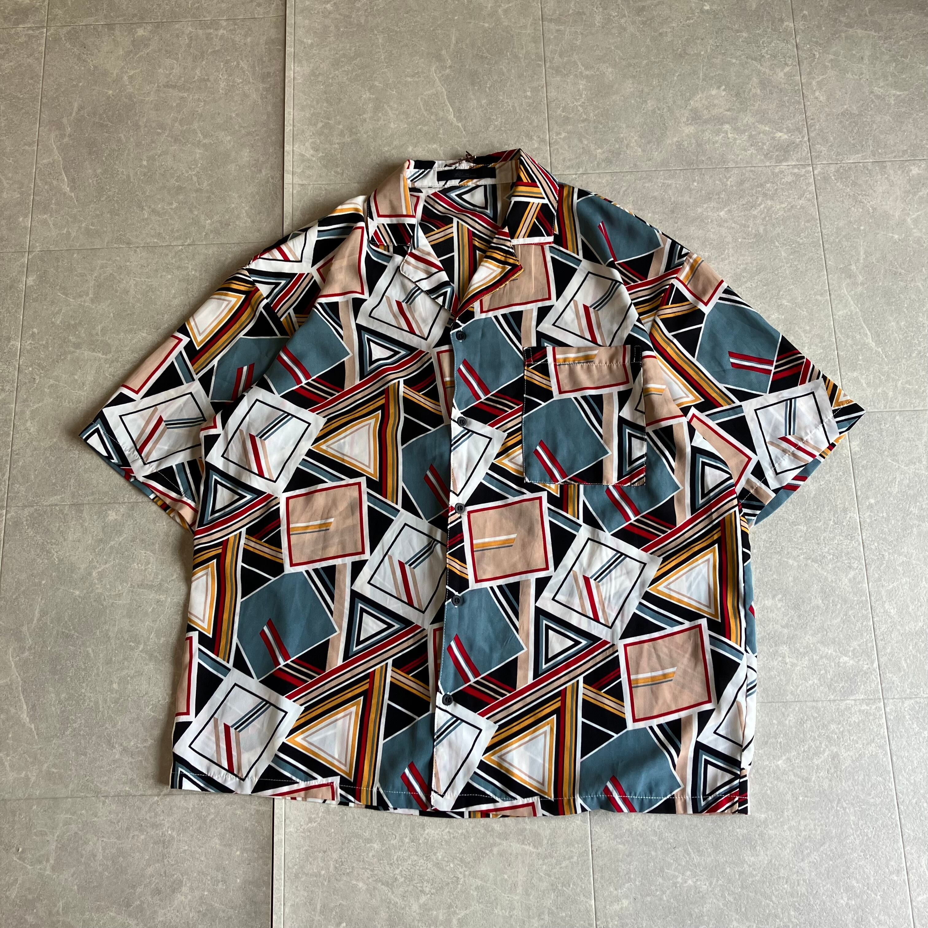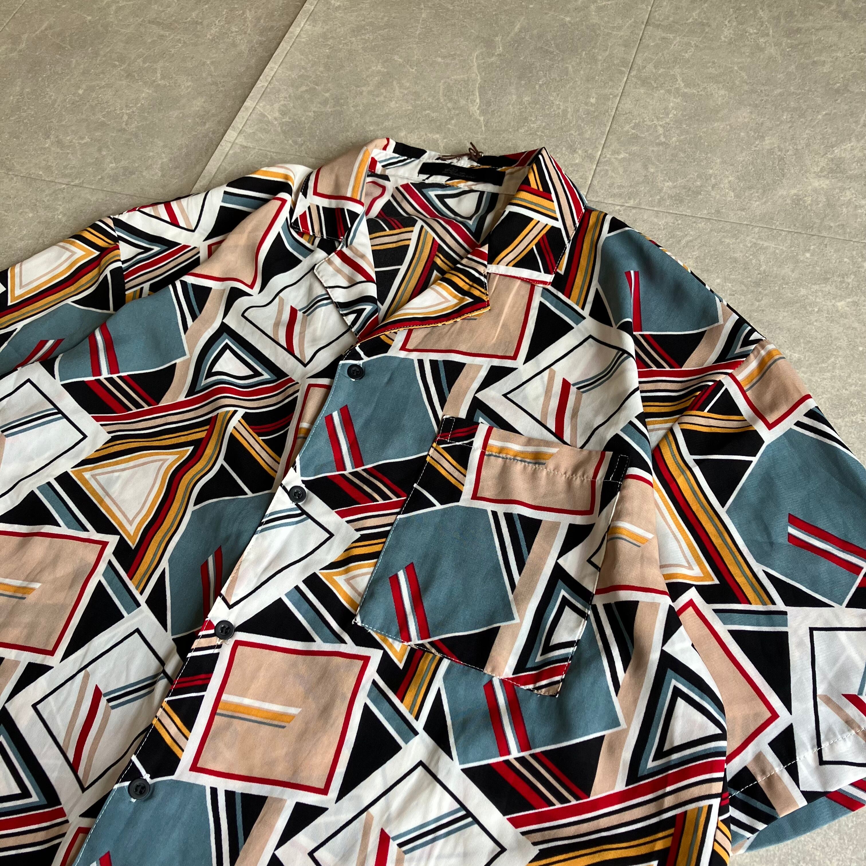 幾何学模様の半袖ポリエステルシャツ、オープンカラーでスタイリッシュ。