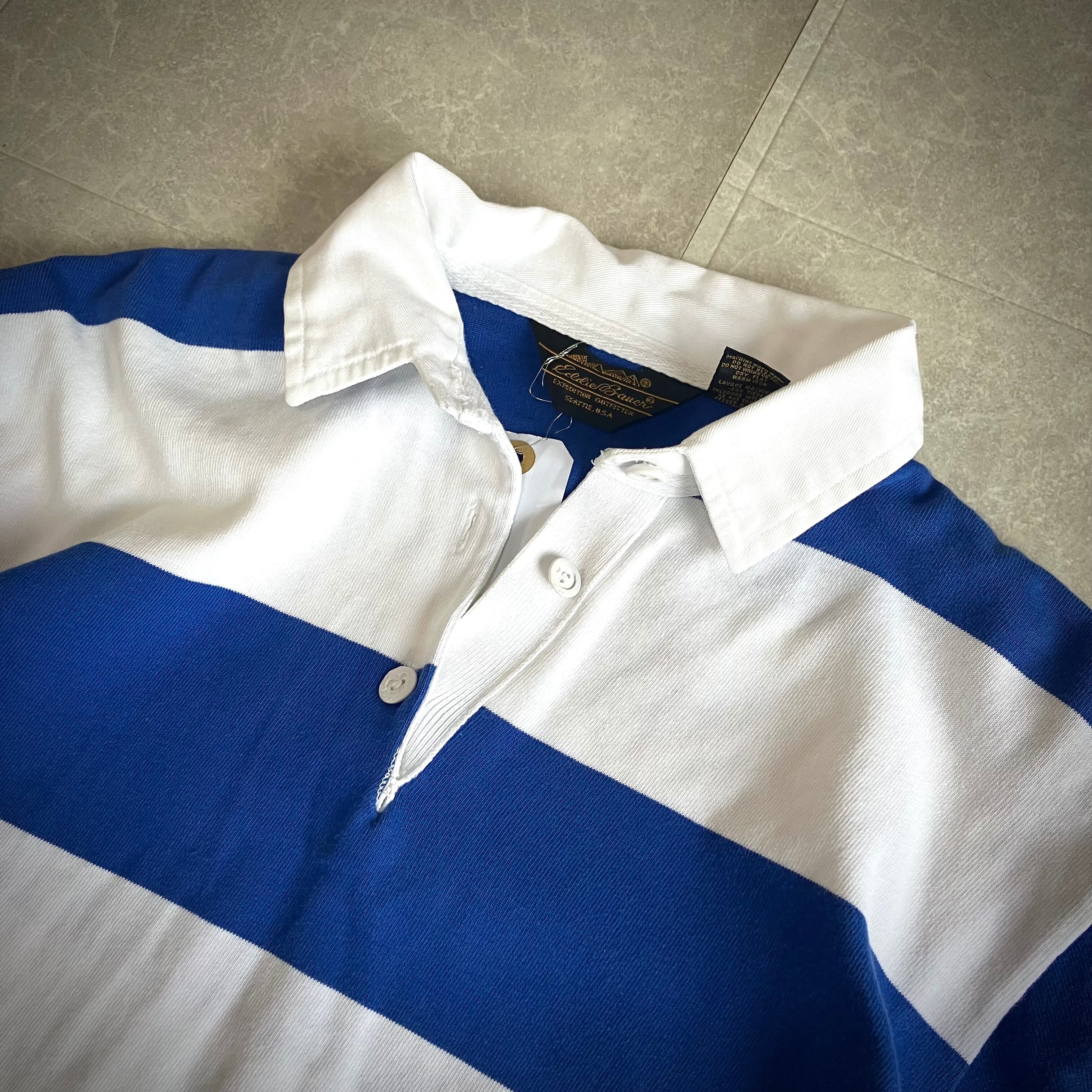Eddie Bauerの青と白のストライプの長袖ポロシャツ、タグ付きの新古品。