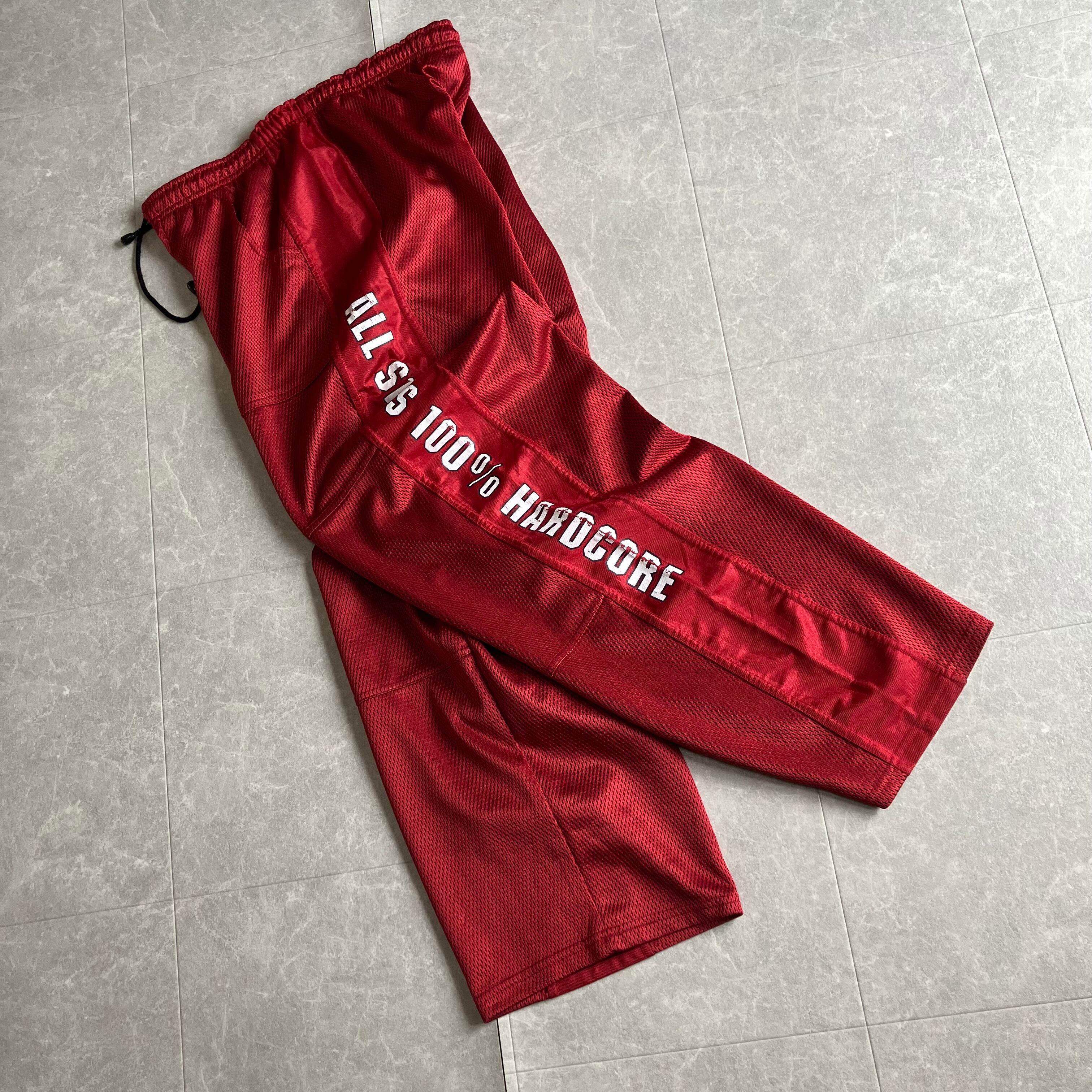 メッシュ素材の赤いバスケットボールパンツ、ウエストゴムとドローコード付き。