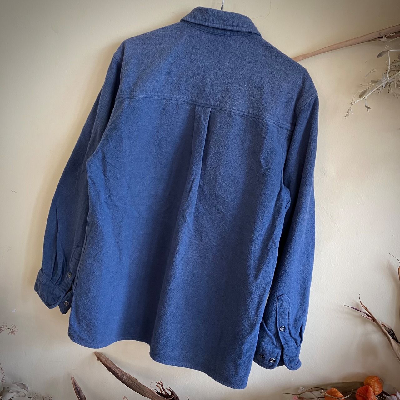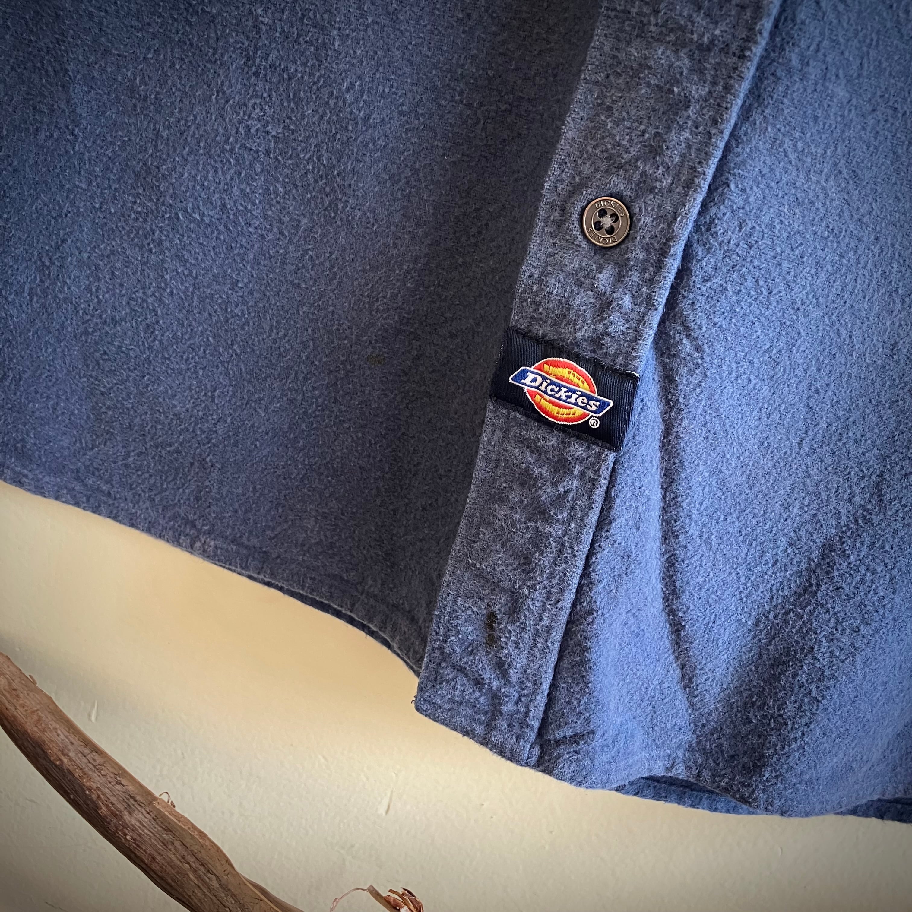 ディッキーズ のネイビーカラーフランネルネルシャツ、長袖、ボタンダウン襟、前面に2つのポケット付き。
