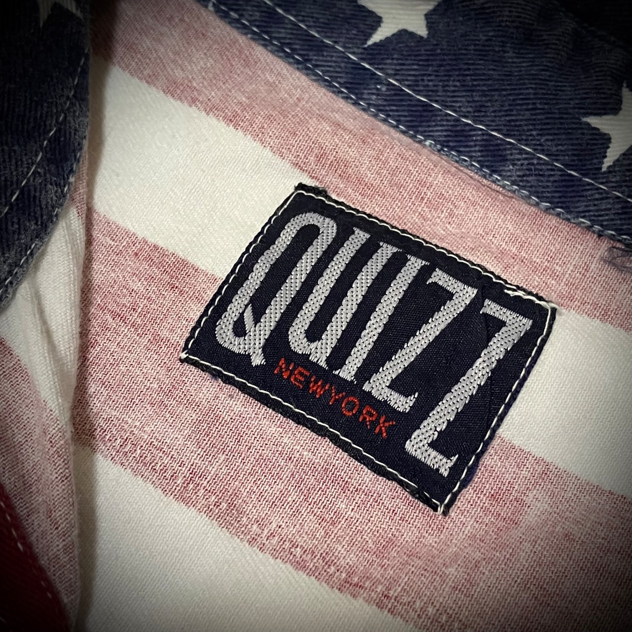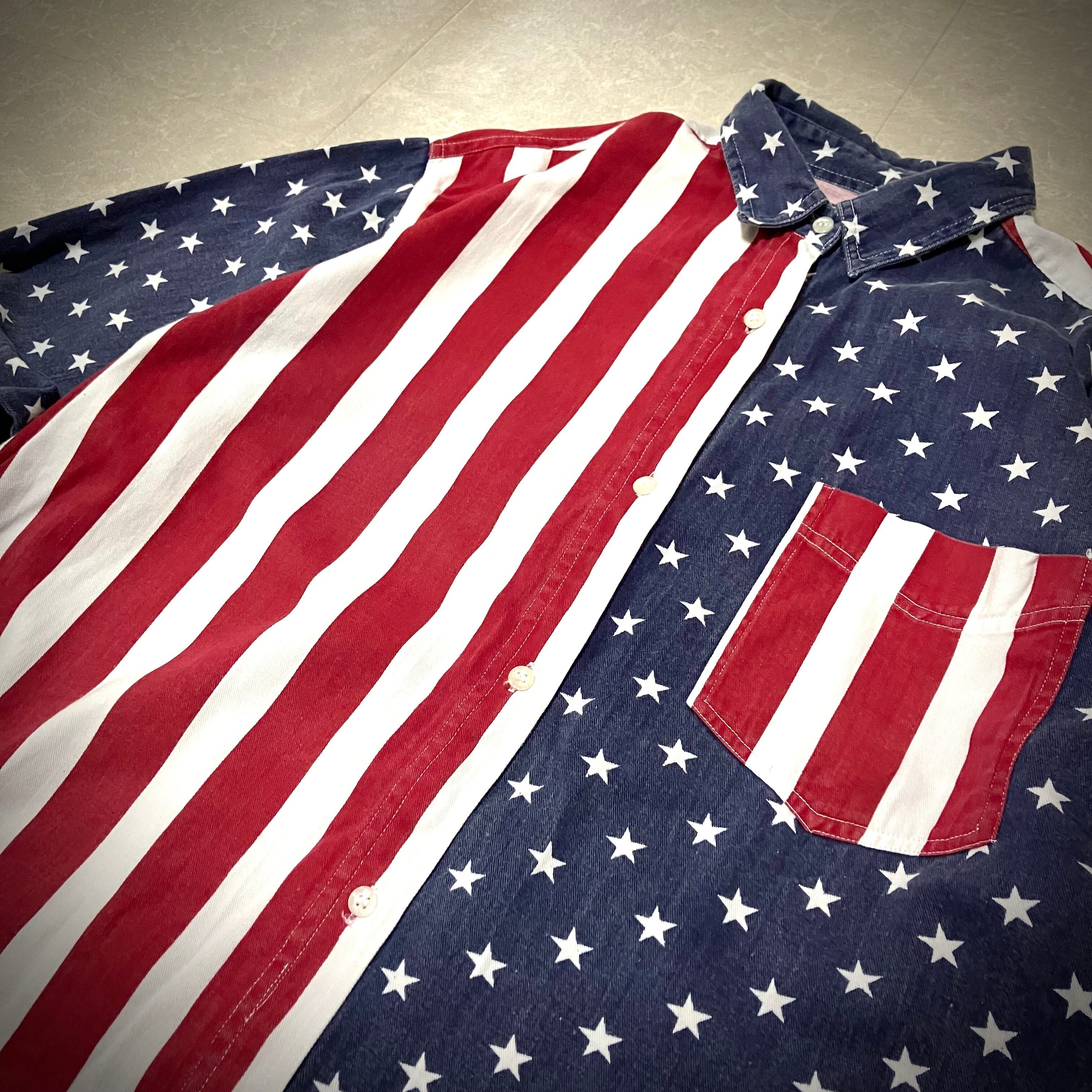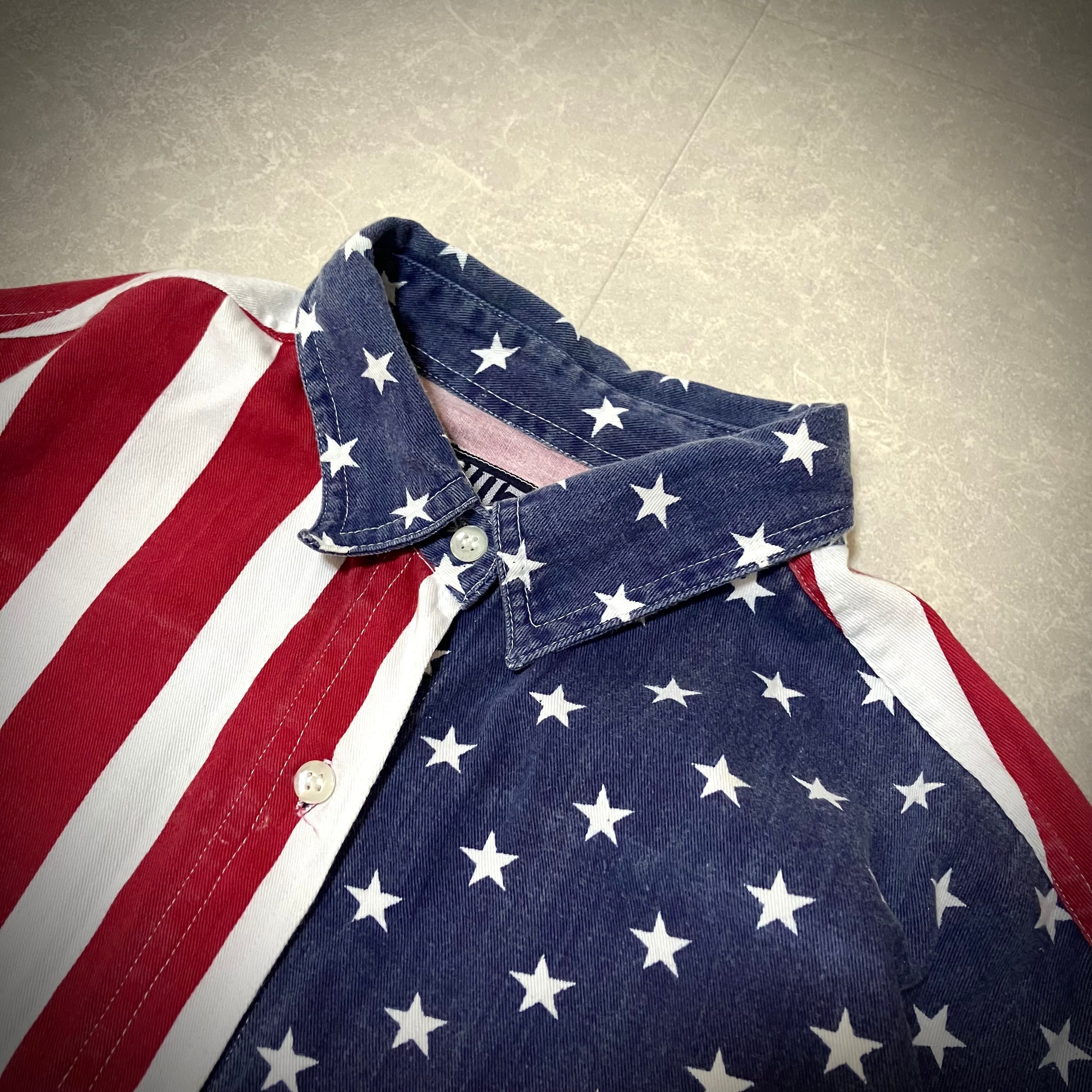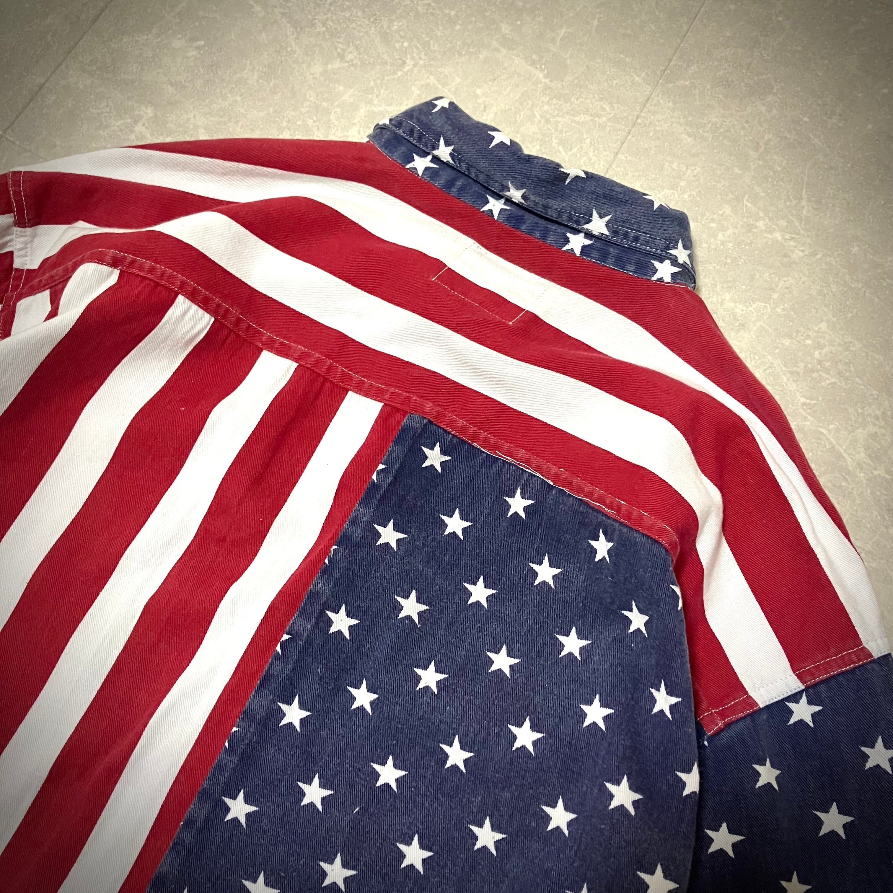 アメリカの国旗、星条旗柄デザインが特徴的な長袖シャツ。