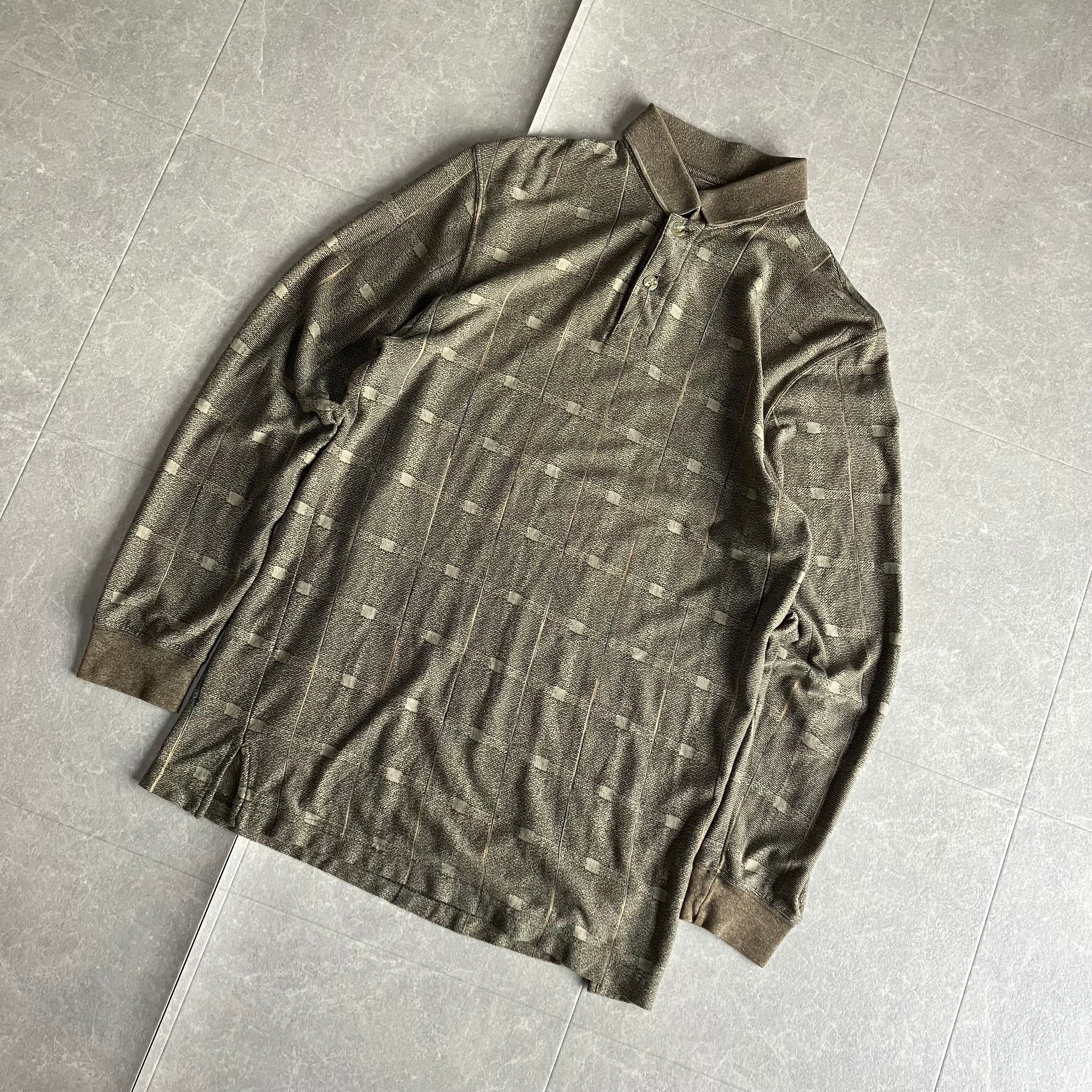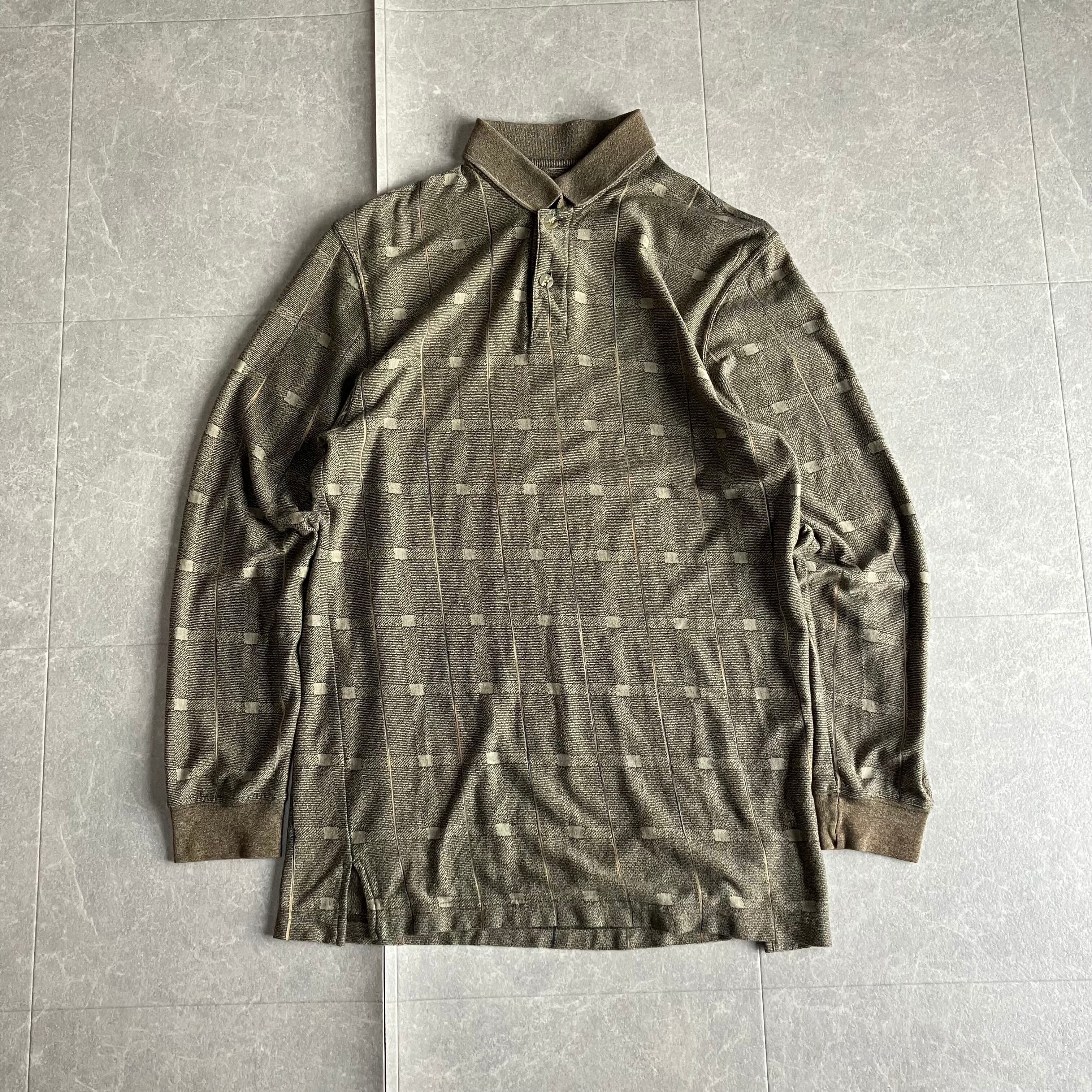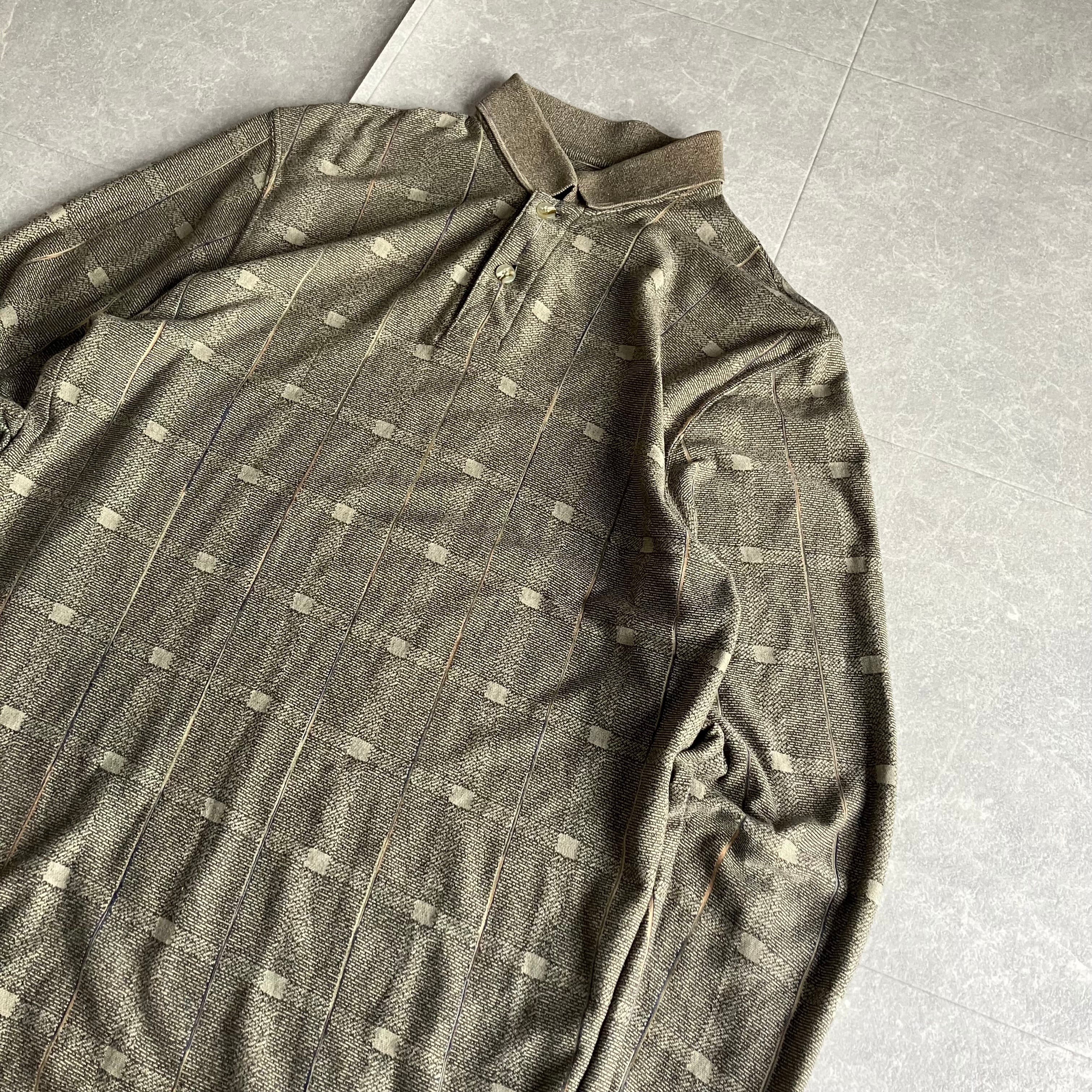 オリーブグリーンのチェック柄ポロシャツ、長袖、2つボタンで少しレトロな雰囲気です。