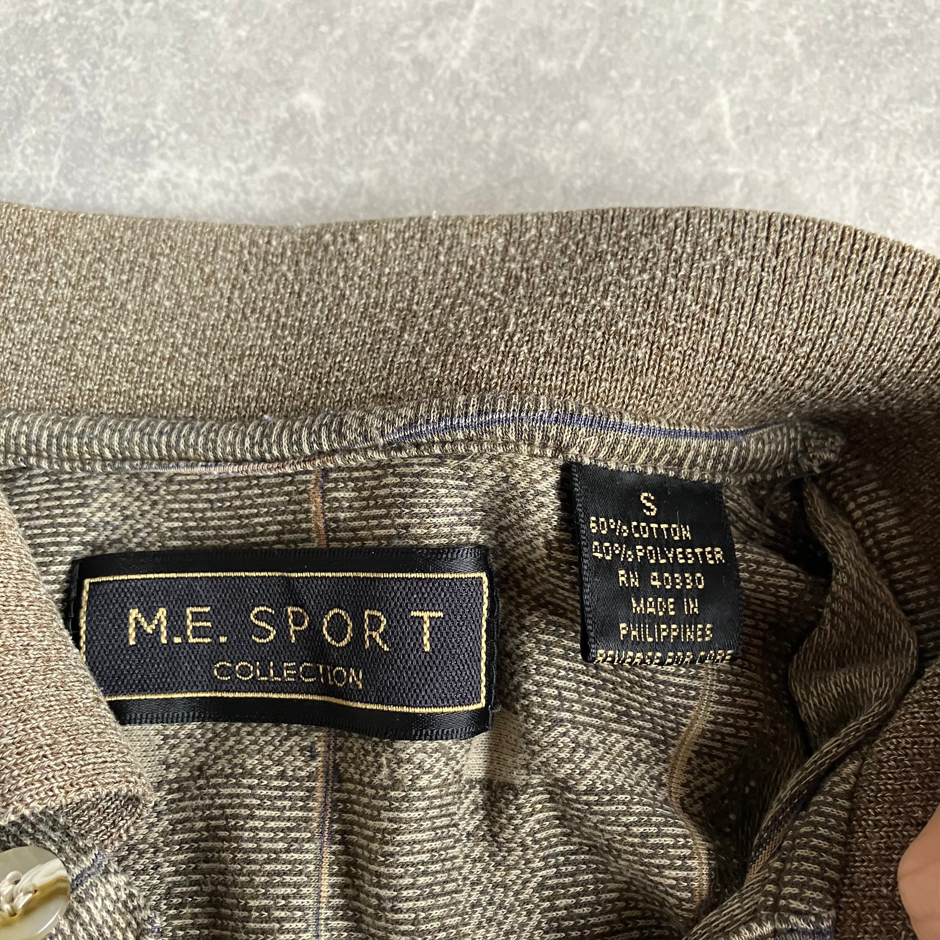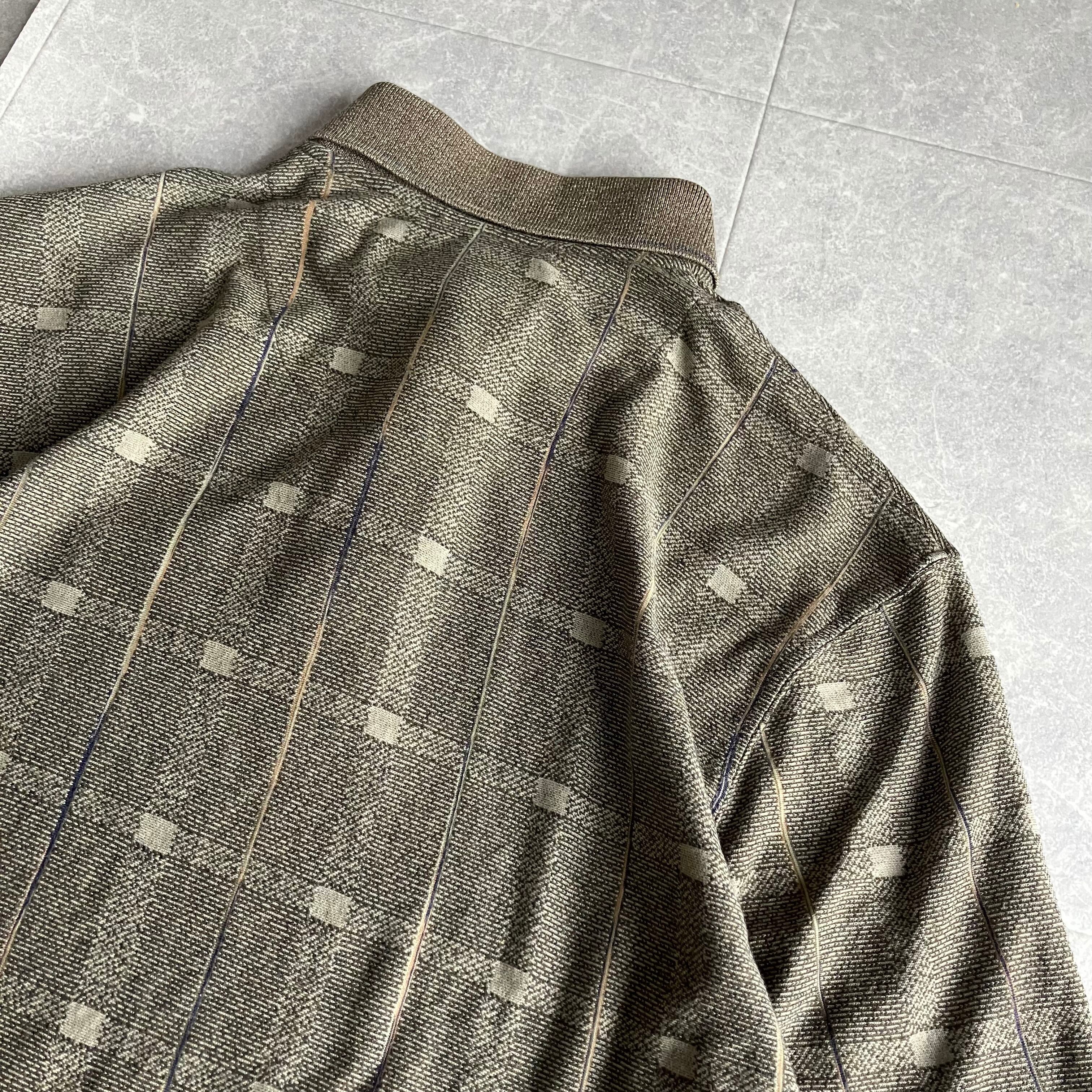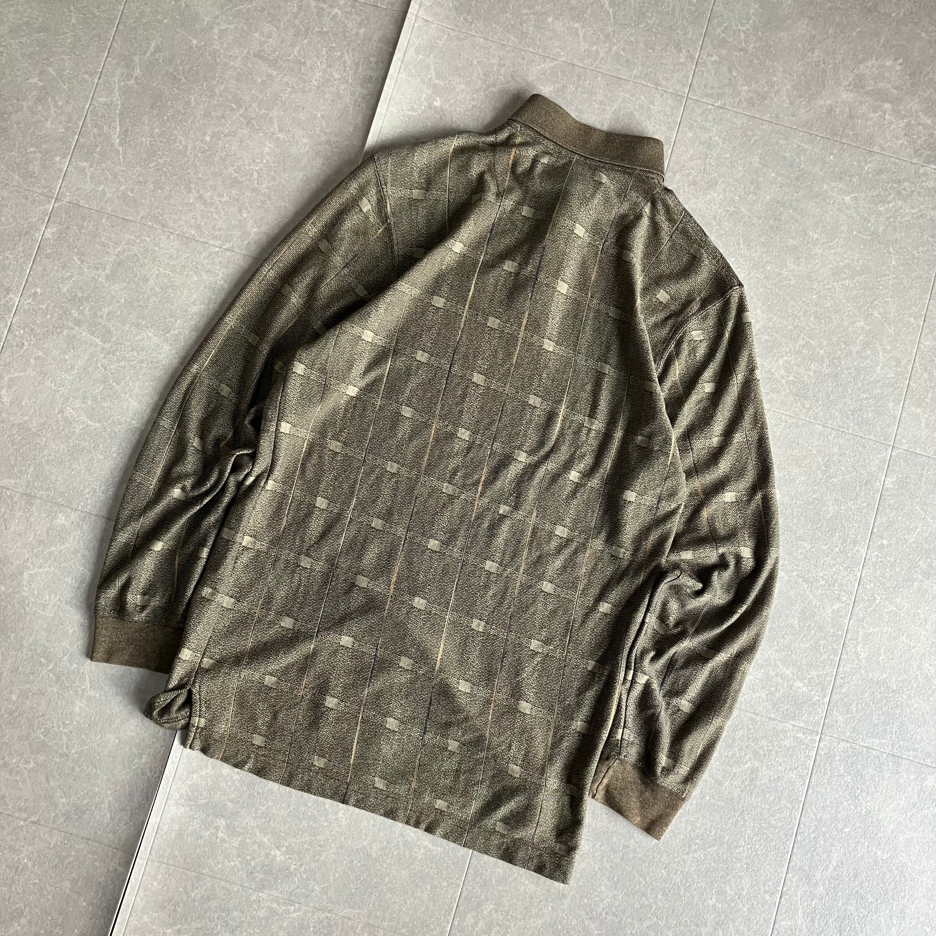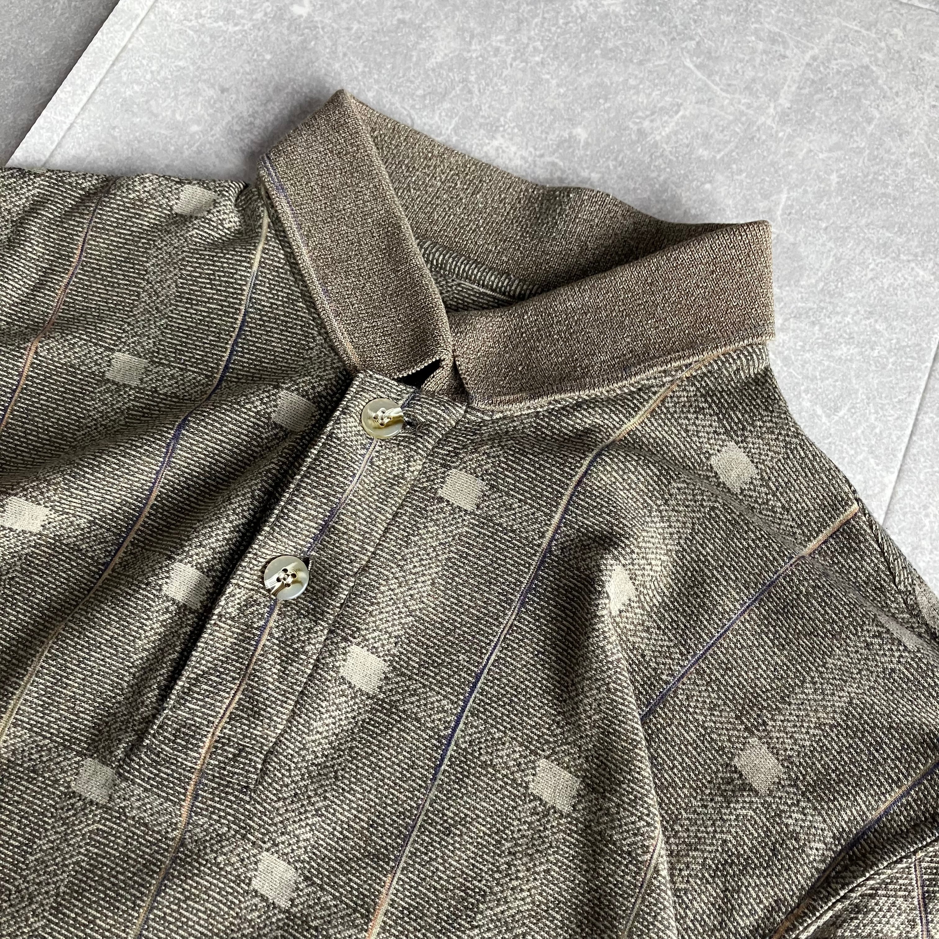 オリーブグリーンのチェック柄ポロシャツ、長袖、2つボタンで少しレトロな雰囲気です。