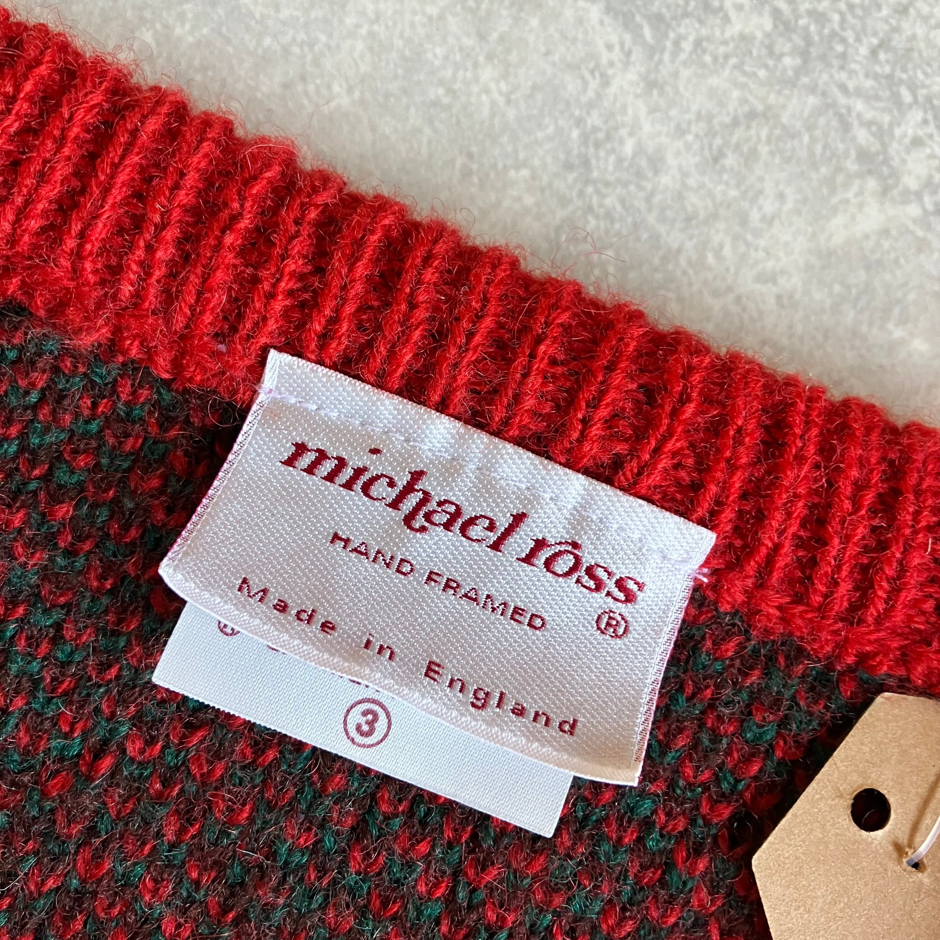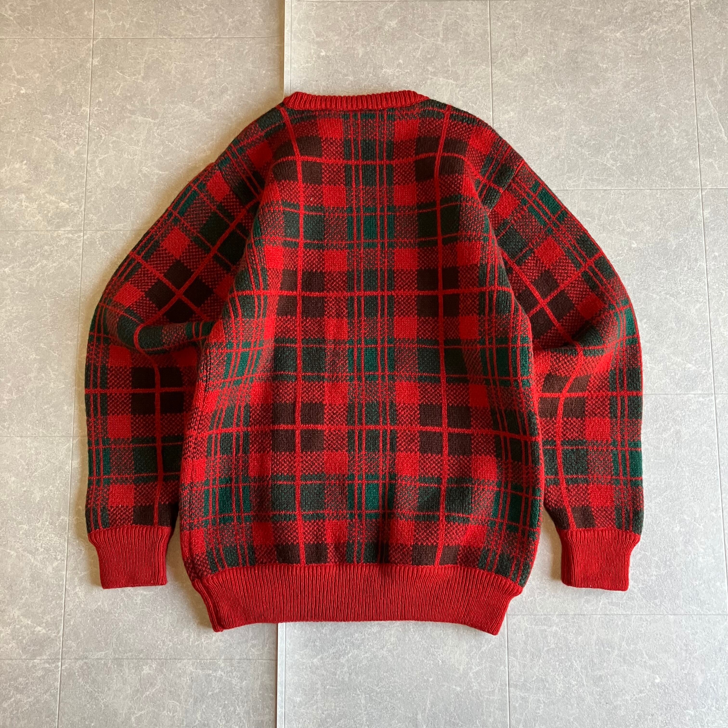 赤と緑のチェック柄ニットセーター、クルーネックデザインです。
